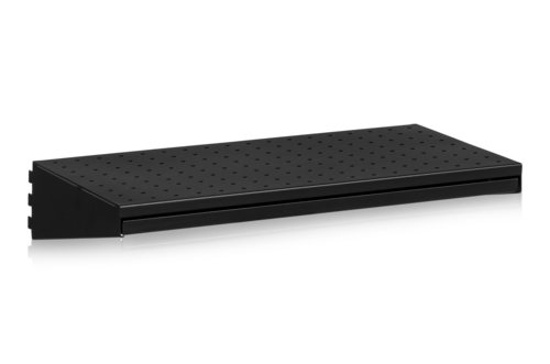 Perforerad skohylla med dropplåt som passar våra vägghängda och fristående hyllsystem. Enkel att höjdjustera. Dropplåten samlar upp grus och smuts.