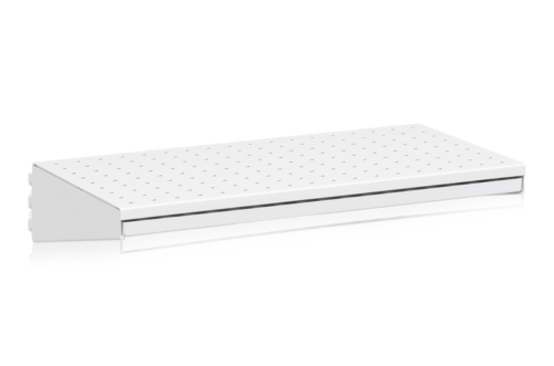 Perforerad skohylla med dropplåt som passar våra vägghängda och fristående hyllsystem. Enkel att höjdjustera. Dropplåten samlar upp grus och smuts.