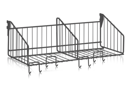 Hatthylla till väggsystem med 2 fack och 4 krokar. Grålackerad.