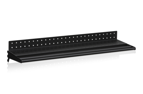 Perforerad hylla med tillhörande klädstång och konsoler som passar till våra vägghängda och fristående hyllsystem. Enkel att höjdjustera.