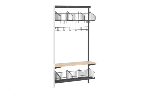 Vägghängd sko- och hatthylla inklusive sittbänk och klädkrokslist (tilläggssektion) för förvaring av kläder och skor. Hyllan går att bygga ut med fler sektioner till ett helt hyllsystem som både har stort förvaringsutrymme och är platsbesparande. Perfekt för att skapa funktionella förvaringslösningar för exempelvis kapprum. Sko- och hatthyllan har tre fack vardera och en dropplåt som samlar upp smuts.