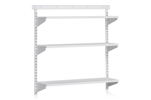 Vägghylla med tre hyllplan (bassektion) som går att bygga ut till ett vägghängt hyllsystem med fler tilläggssektioner. Här finns det möjlighet att bygga ett hyllsystem som både har stort förvaringsutrymme och är platsbesparande. Lastkapacitet varierar beroende på väggkonstruktion och infästning.