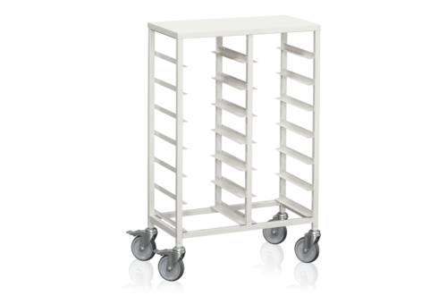 Brickvagn tillverkad av stålrör, pulverlackerad vit. Vagnen har plats för 14 brickor och är utrustad med fyra hjul, varav två är låsbara. Underlättar arbetet i offentliga miljöer som restauranger, matsalar eller caféer och gör det enkelt att hantera större mängder med disk. Robust och slittålig, vilket är betydelsefullt då vagnen utsätts för mycket dagligt slitage och yttre påverkan.