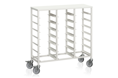 Brickvagn tillverkad av stålrör, pulverlackerad vit. Vagnen har plats för 21 brickor och är utrustad med fyra hjul, varav två är låsbara. Underlättar arbetet i offentliga miljöer som restauranger, matsalar eller caféer och gör det enkelt att hantera större mängder med disk. Robust och slittålig, vilket är betydelsefullt då vagnen utsätts för mycket dagligt slitage och yttre påverkan.